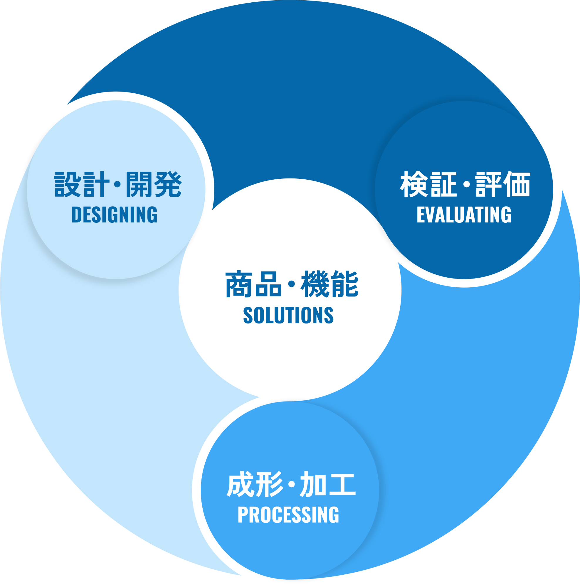 射出成形をはじめ、圧縮成形、押出成形はもちろん、切削加工など従来の成形・加工技術に様々な工法を加えて、材料特性と要求スペックに最適な工法を導きだします。