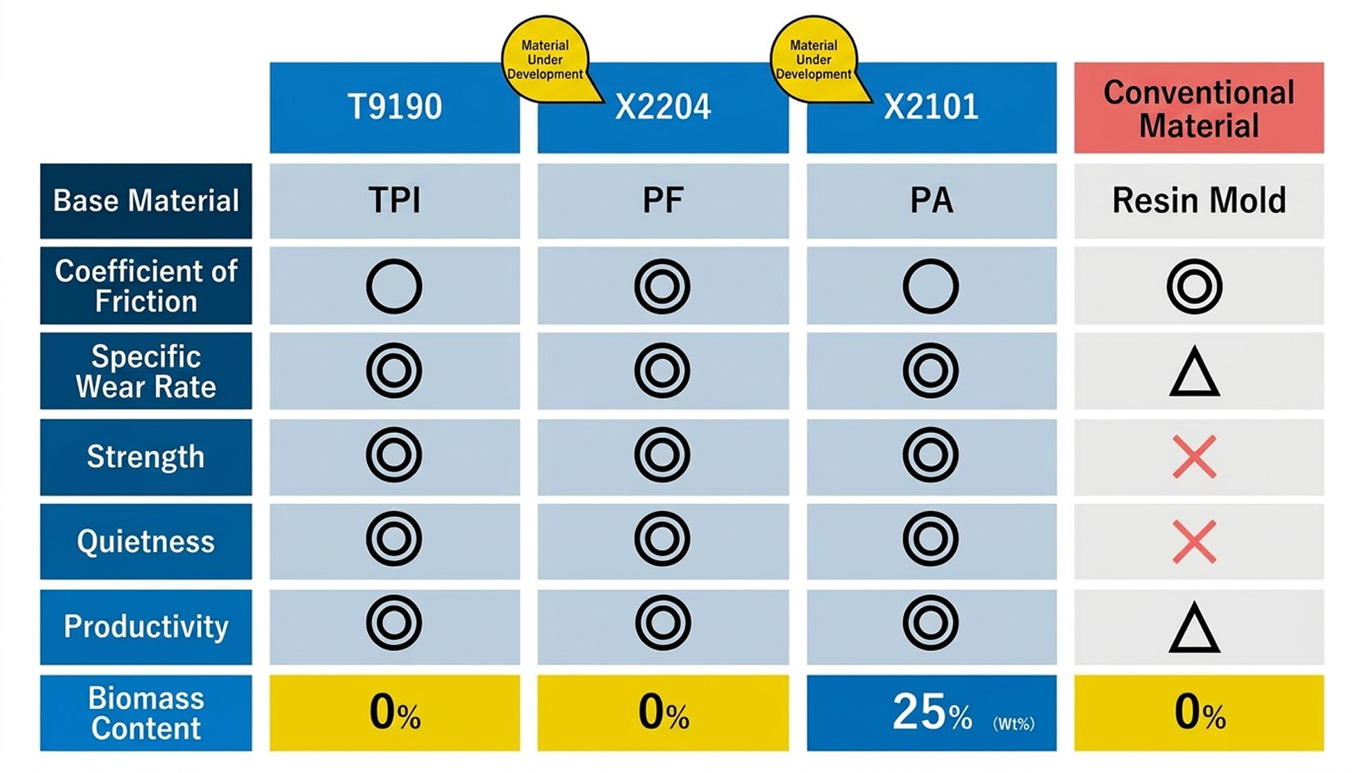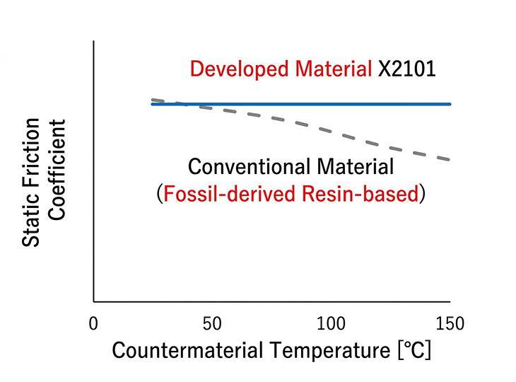 X2101 is a newly developed brake friction material that shows minimal change in friction and wear performance as temperature varies, compared with conventional grades based on fossil-derived resins. This stability supports quiet operation and consistent holding torque and braking torque, making it a strong candidate for power-off (fail-safe) brakes used for holding and emergency stopping in collaborative robots (cobots)—a need expected to grow from large-scale factories to smaller workplaces.