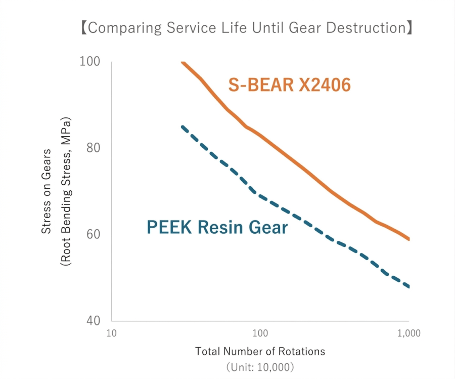 A new long-life gear material has been added to the S-BEAR® series, the original material of Starlite. The new gear material (X2406) achieves a longer service life than PEEK* resin, which is generally used for high-durability applications. Another feature is its ability to deliver stable gear characteristics under high loads across a wide temperature range from ambient temperature to 150 °C. We will continue to offer highly cost-effective proposals for applications such as FA systems, robots, industrial machinery, and mobility.